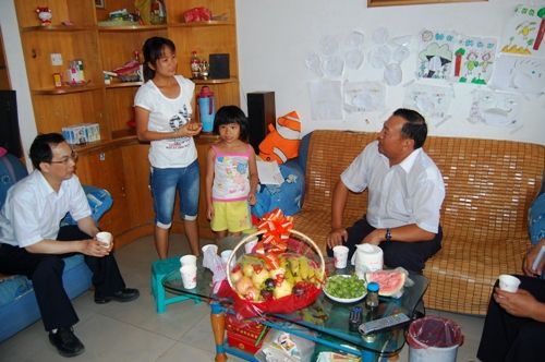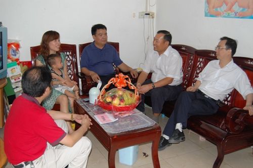 图为罗业凤总司理等向导在员工龙如演家中探望其眷属并与之亲热攀谈