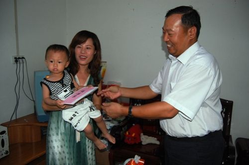 图为罗业凤总司理等向导在员工覃林家中探望其幼子并与眷属举行亲热攀谈