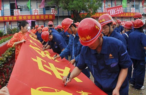 与会代表在清静生产月运动横幅上署名,以现实验动批注做好安生生产事情的信心与刻意