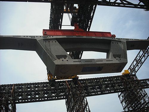 2011年1月21日上午11时38分,陪同着响亮而强烈的鞭炮声,巴巴奥约河大桥32#墩0#块被水上门吊吊离运梁浮箱,经由空中滑翔顺遂装置到位,这标记着巴巴奥约河大桥水上门吊经由设计、施工、试吊等环节正式投入施工生产。